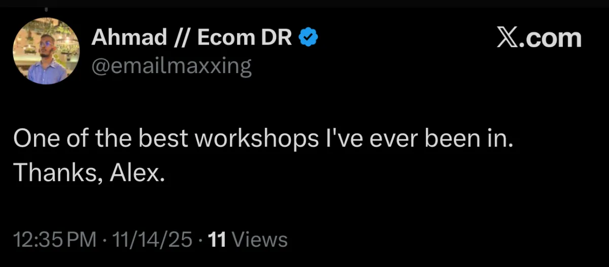 "Everyone online talks about ‘charging more,’ but this workshop actually shows you how. The frameworks, homework, and step-by-step roadmap gave me exactly what I needed to start moving upmarket fast." – Mueez Ahmed